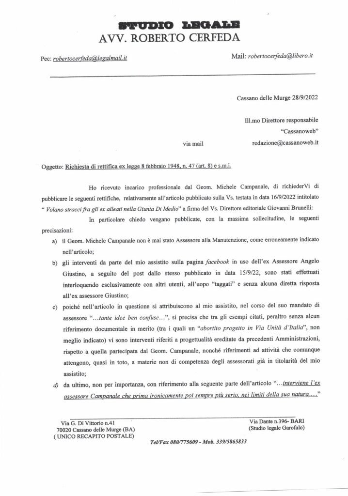 In merito ad un nostro articolo dello scorso 16 settembre 2022 riceviamo e pubblichiamo una nota dell’avv.to Cerfeda da parte dell’ex Assessore Michele Campanale con la quale si chiede di apportare una serie di rettifiche e chiarire un passaggio del nostro scritto con il quale si voleva sottolineare (questa è la spiegazione) il carattere notoriamente gioviale dell’ex Assessore che fa dello scherzo e dell’ironia – alla pari dei suoi elettori, vecchi e attuali – una cifra stilistica del suo fare “politica”.