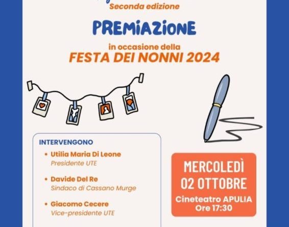 Si terrà mercoledì 2 ottobre, in occasione della “Festa dei Nonni”, la premiazione della seconda edizione del concorso “Nonni e nipoti – un legame da raccontare” organizzato dall’UTE di Cassano delle Murge con il patrocinio del Comune.