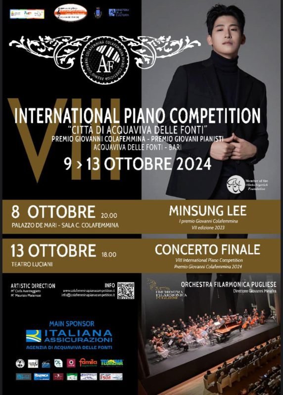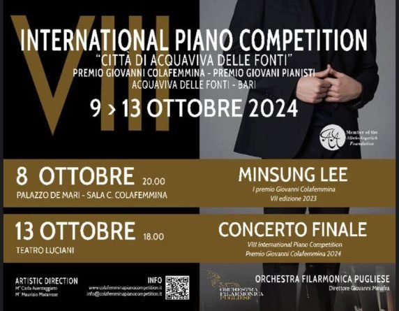 Dal prossimo 8 ottobre al 13 ottobre 2024, Acquaviva delle Fonti accoglierà l’ottava edizione del Concorso Internazionale Pianistico “Premio Giovanni Colafemmina – Premio Giovani Pianisti”. Ringrazio pertanto l’eccellente organizzazione curata dall’Associazione Colafemmina che da anni si adopera alla promozione e cultura della musica di qualità.
