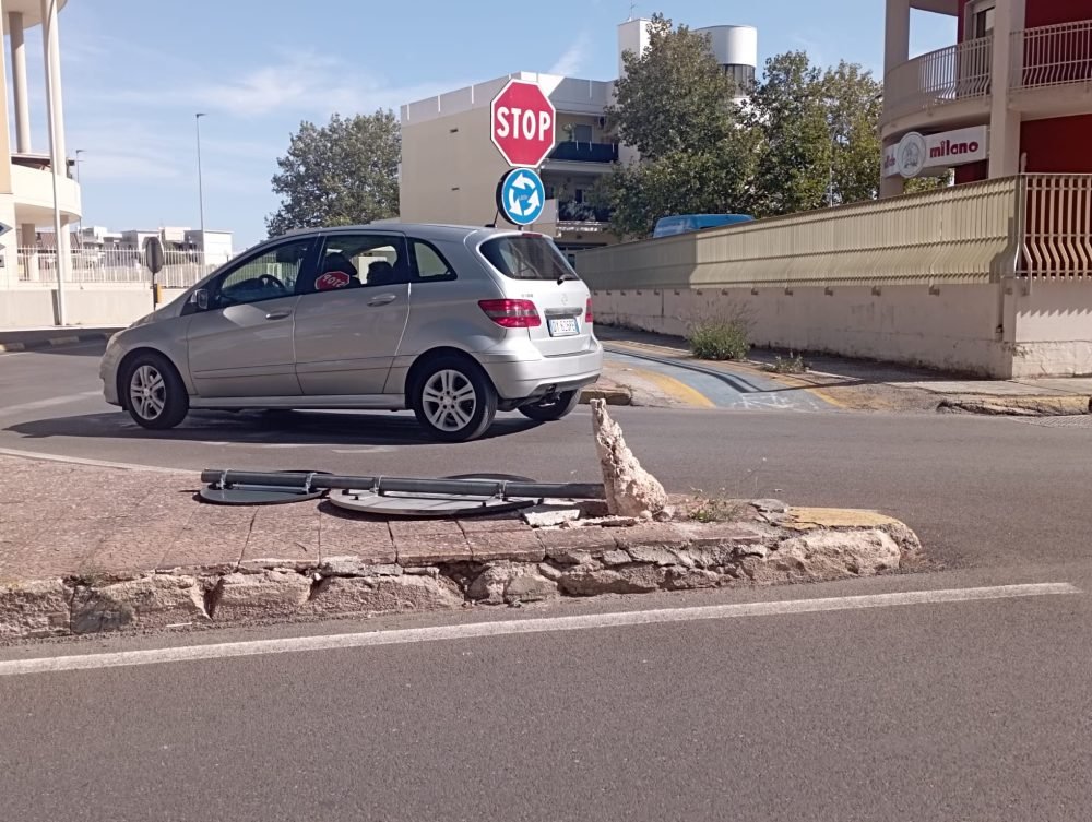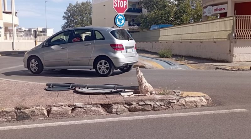 Lo spettacolo che si presenta è il seguente: palo letteralmente divento e segnale adagiato con il suo sostegno sulla rotonda.