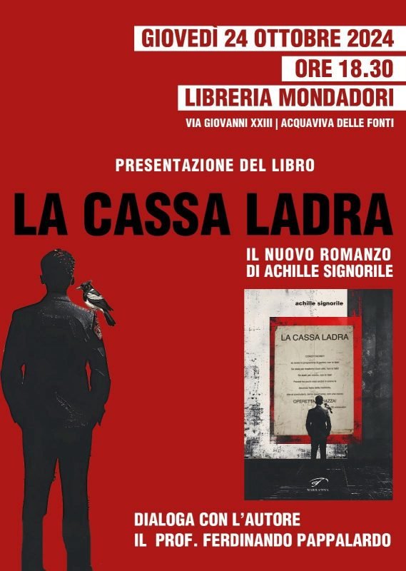 Appuntamento da non perdere giovedì 24 ottobre 2024 alle ore 18:30 presso la libreria Mondadori in via Giovanni XXIII ad Acquaviva delle Fonti per la presentazione del libro “La Cassa Ladra” di Achille Signorile edito da Edizioni Il Foglio