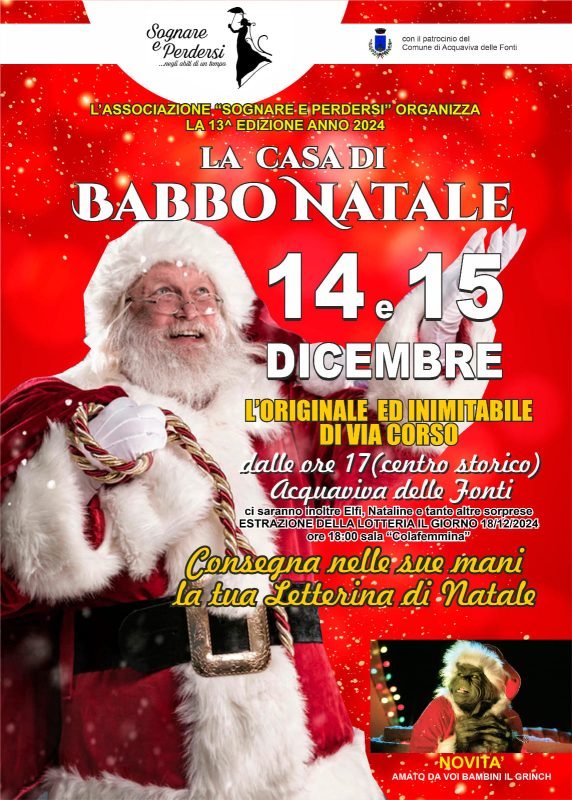 L’Associazione “Sognare e Perdersi” organizza con il patrocinio del Comune di Acquaviva delle Fonti la 13^ edizione de “La Casa di Babbo Natale” in via Corso nel centro storico di Acquaviva delle Fonti.