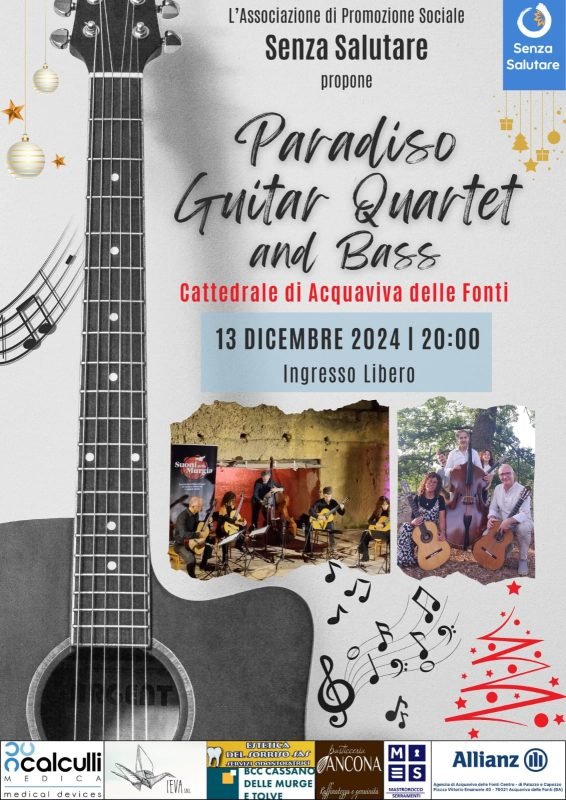 L’Associazione di Promozione Sociale Senza Salutare propone questa sera alle ore 20:00 nella splendida cornice della Cattedrale di Acquaviva delle Fonti “Paradiso “Guitar Quartet and Bass” con musiche di Vito Nicola Paradiso, Morricone e classici del repertorio natalizio novecentesco.