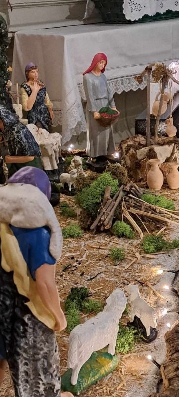 Le statue, prima di trovare collocazione nel presepe, sono coccolate, osservate con curiosità per essere capite, per scegliere la migliore posizione possibile da assegnare. Il pastore e le pecore dominano la scena. Il campo di muschio verde che circonda sempre la grotta è diventato un campo da pascolo che lentamente conduce alla grotta.