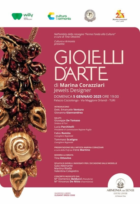 Domenica 5 gennaio, a partire dalle 18:30, all’interno dello storico Palazzo Cozzolongo, sede dell’APS Cultura e Armonia (via Maggiore Orlandi 10/12, Turi), si celebra il talento creativo di Marina Corazziari, designer di gioielli, stilista, scenografa e docente.