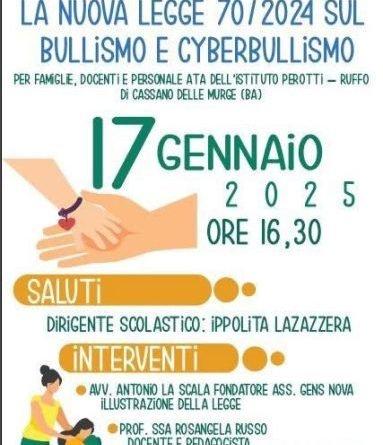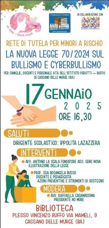 Si terrà il 17 gennaio 2025, presso la Biblioteca della Scuola Media Vicenza Ruffo di Cassano delle Murge alle ore 16.30 il focus sulla nuova legge sul bullismo e cyberbullismo.