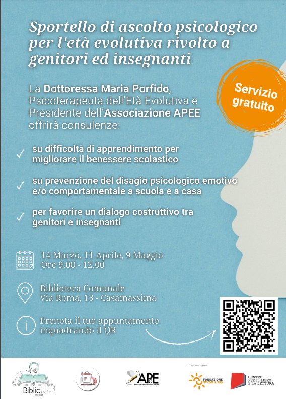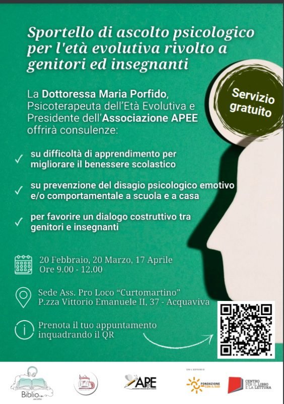 La Dottoressa Maria Porfido, Psicoterapeuta dell’Età Evolutiva e Presidente dell’Associazione APEE, offrirà consulenze su: