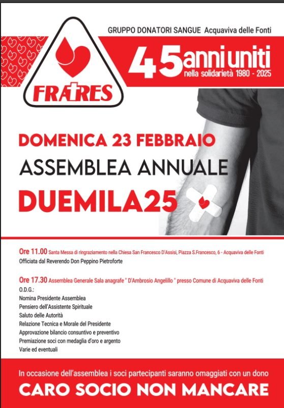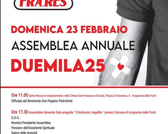 Domenica 23 febbraio 2025 alle ore 17.30, si terrà presso la Sala Comunale “Angelillo D’Ambrosio” (sala Anagrafe) in piazza Vitt. Emanuele III° ad Acquaviva delle Fonti, la consueta Assemblea annuale dell’Associazione Donatori di Sangue “FRATRES” di Acquaviva delle Fonti.