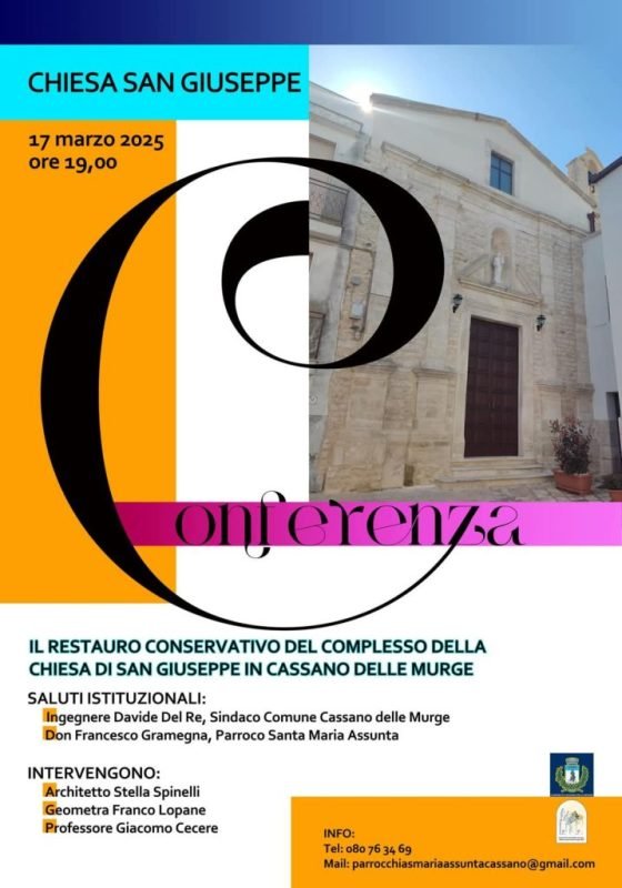 network Conferenza sul restauro della Chiesa di San Giuseppe 10 Marzo 2025 admin Lunedì 17 marzo alle ore 19.00 Conferenza sul recente restauro conservativo della Chiesa di San Giuseppe, presso la stessa chiesa a cura della Parrocchia Santa Maria Assunta.