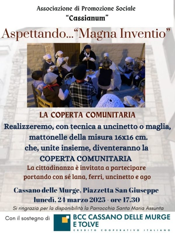 Per prepararci agli eventi (dal 15 al 18 maggio) lunedì 24 marzo 2025 a partire dalle ore 17.30, presso la piazzetta di san Giuseppe a Cassano delle Murge, prenderà l’avvio la realizzazione della Coperta Comunitaria per la quale ognuno potrà costruire un pezzo e che sarà poi esposta durante i giorni della Festa.