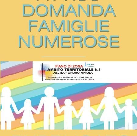In esecuzione del D.G.R. n. 220/2020 – con il quale la Regione Puglia ha approvato il “Programma di Interventi per le Famiglie Numerose- che ha come obiettivo l’abbattimento dei costi delle tariffe per la fornitura di beni e la fruizione di servizi, nonché agevolazioni e riduzioni di particolari imposte e tasse locali, dedicati alle famiglie numerose, è stato assegnata all’Ambito Territoriale e Sociale di Grumo Appula la somma pari a € 42.260,39