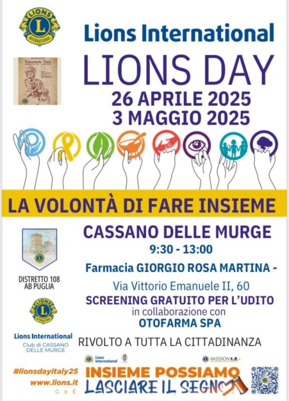 Service LIONS DAY 2025, nella volontà di fare insieme e lasciare un segno si effettuerà uno screening gratuito per l’udito , presso la Farmacia Giorgio nei giorni dal 26 aprile al 3 maggio 2025.