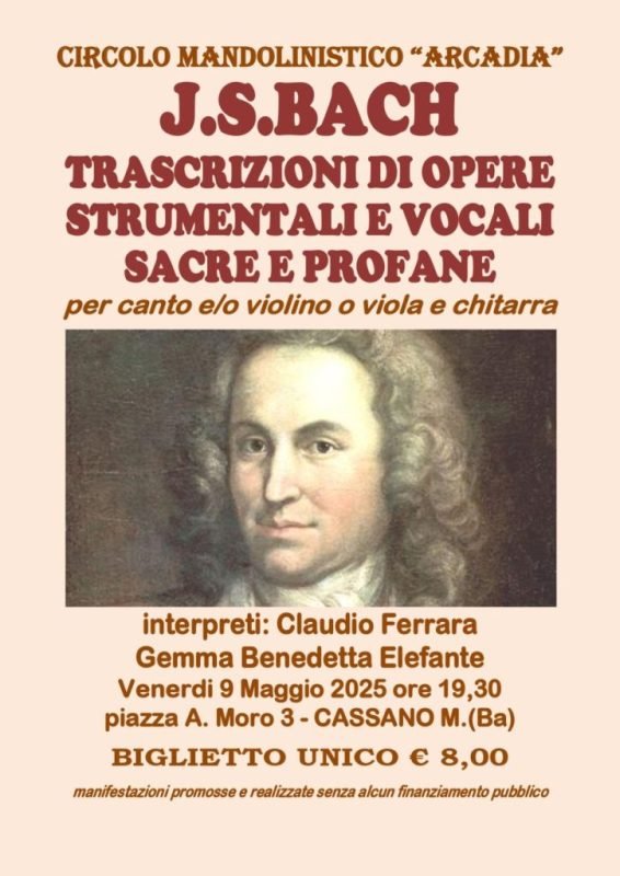 Prosegue la stagione concertistica del circolo mandolinistico Arcadia. Il penultimo appuntamento 24/25 vede interpreti Claudio Ferrara (canto e chitarra) con Gemma B. Elefante (violino o viola), che eseguiranno trascrizioni di brani vocali e strumentali, sacri e profani di J. S. Bach. Appuntamento in piazza A. Moro 3 venerdì 9 Maggio p.v. alle 19,30.