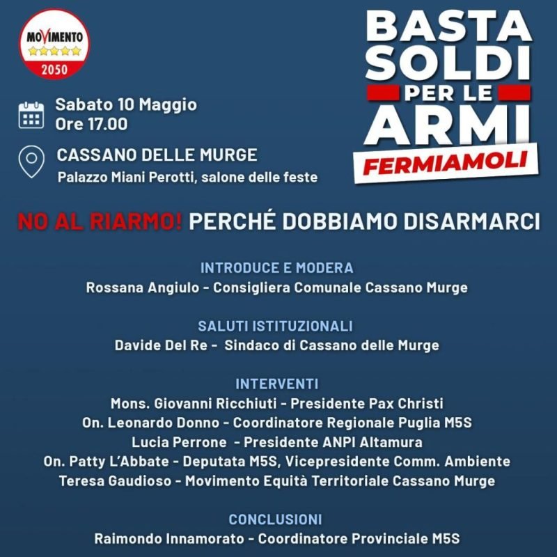 Si terrà sabato 10 maggio 2025 alle ore 17.00, presso il Palazzo Miani Perotti di Cassano delle Murge (Via Miani- Salone delle Feste) la conferenza sul tema “NO AL RIARMO PERCHÉ DOBBIAMO DISARMARCI!” organizzata dal “Movimento 5 Stelle” di Cassano delle Murge.