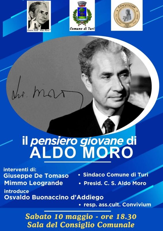 Sabato 10 maggio, alle ore 18.30, la Sala del Consiglio Comunale di Turi ospiterà un appuntamento di grande rilievo culturale e civile dedicato al “pensiero giovane” di Aldo Moro, figura simbolo della democrazia italiana del secondo dopoguerra.