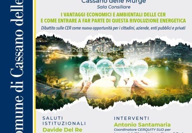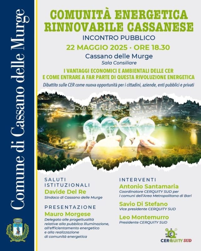 Giovedì 22 maggio 2025 alle ore 18.30 presso la Sala Consiliare del Comune di Cassano delle Murge avrà luogo l’incontro pubblico “Comunità energetica rinnovabile cassanese”.