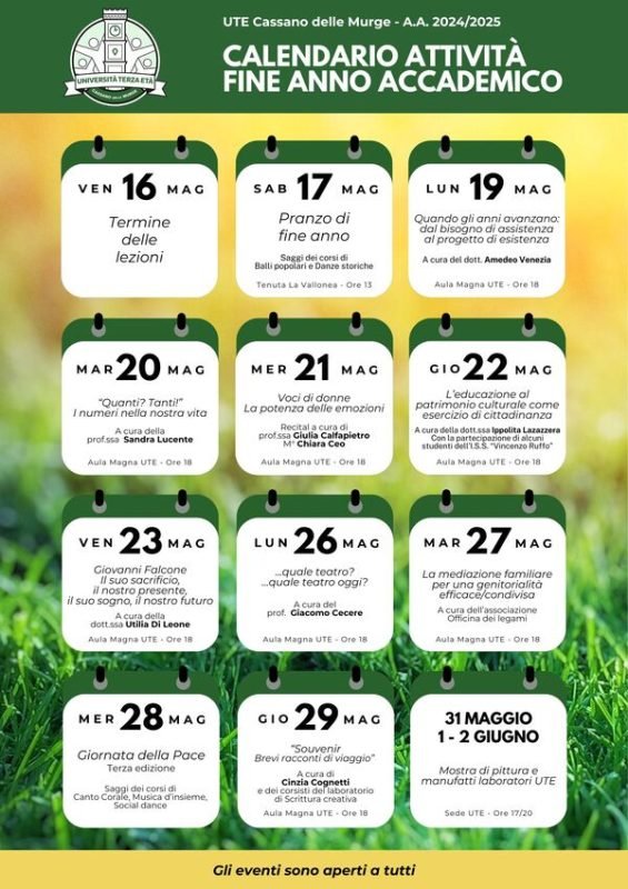 In questo 2025 l’anno accademico dell’Università della Terza Età si concluderà in modo del tutto nuovo: dal 19 al 29 maggio si darà il via a “I Giorni della Cultura” ovvero una serie di incontri con autorevoli ospiti che ogni giorno intratterranno il pubblico su diverse tematiche di grande interesse ed impatto emotivo.