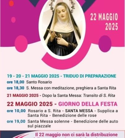 La santa agostiniana per eccellenza sarà celebrata con una Santa Messa alle ore 10.00, cui seguirà la Supplica e la benedizione delle rose (chi vorrà lo porterà da casa: non saranno distribuite presso il Convento), fiore caro alla santa di Cascia ed alle ore 19.00 con la santa messa solenne.