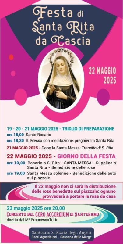 Si rinnova giovedì 22 maggio la Festa di Santa Rita, presso il Santuario della Madonna degli Angeli di Cassano delle Murge.