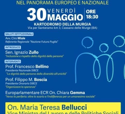 Si terrà venerdì 30 Maggio ore 18.30 presso il Kartodromo della Murgia a Cassano delle Murge l’evento “Le politiche di inclusione nel panorama europeo ed italiano”, organizzato dai circoli pugliesi dell’associazione culturale “Nazione Futura”, il cui Presidente nazionale è Francesco Giubilei, in collaborazione con il SIBCE (Società Italiana per la Bioetica e i Comitati Etici) ed il Cif Metropolitano Bari (Centro Italiano Femminile) che vedrà la partecipazione del Vice Ministro del lavoro e delle politiche sociali On. Maria Teresa Bellucci.