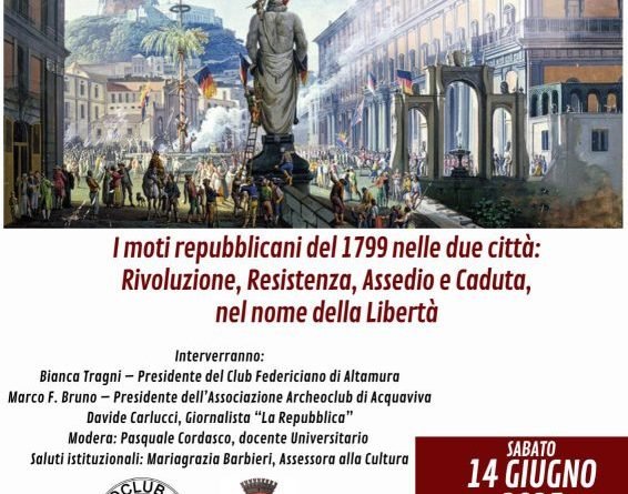 Sabato 14 giugno 2025 “Acquaviva e Altamura l’ultimo assedio” alle ore 17:00 presso la sala D’Ambrosio-Angelillo di Palazzo De Mari, in occasione della ricorrenza della caduta della Repubblica Napoletana del 1799, si terrà la conferenza sui moti repubblicani del 1799 nelle due città: “Rivoluzione, Resistenza, Assedio e Caduta, nel nome della Libertà”