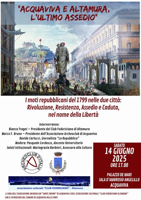 Sabato 14 giugno 2025 “Acquaviva e Altamura l’ultimo assedio” alle ore 17:00 presso la sala D’Ambrosio-Angelillo di Palazzo De Mari, in occasione della ricorrenza della caduta della Repubblica Napoletana del 1799, si terrà la conferenza sui moti repubblicani del 1799 nelle due città: “Rivoluzione, Resistenza, Assedio e Caduta, nel nome della Libertà”