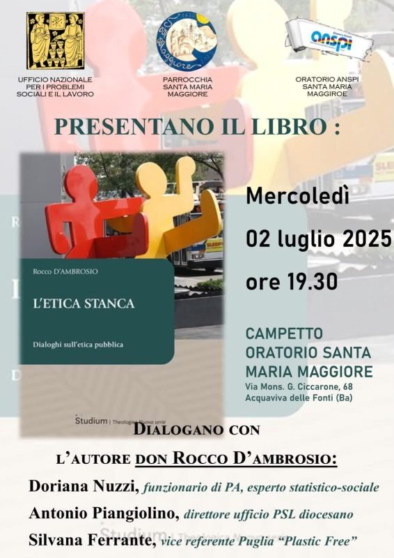 L’Ufficio Nazionale per i problemi sociali e il lavoro, la Parrocchia Santa Maria Maggiore e l’Oratorio ANSPI Santa Maria Maggiore presentano mercoledì 2 luglio 2025 alle ore 19:30 il libro di Don Rocco D’Ambrosio “L’Etica stanca. Dialoghi sull’etica pubblica” pubblicato da Edizioni Studium.