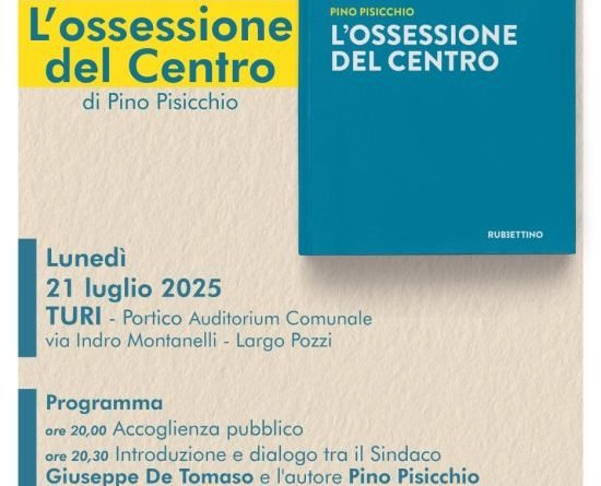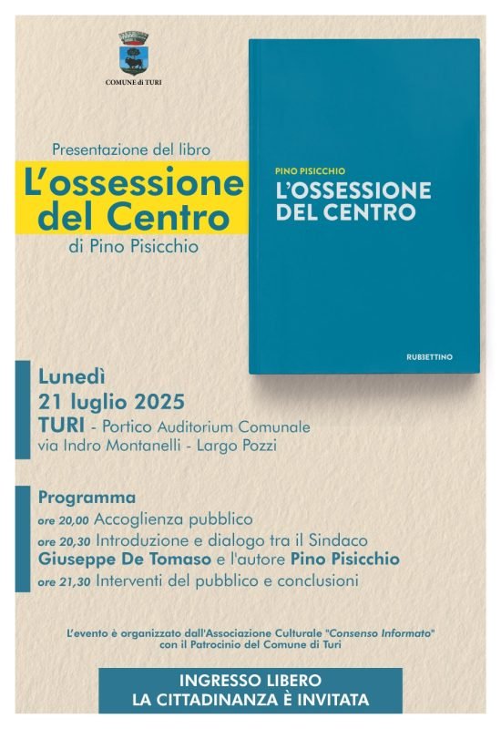 Lunedì 21 luglio 2025, alle ore 20:00, nel Portico dell’Auditorium Comunale di Turi (via Indro Montanelli – Largo Pozzi), si terrà la presentazione del libro “L’ossessione del Centro” di Pino Pisicchio, edito da Rubbettino.