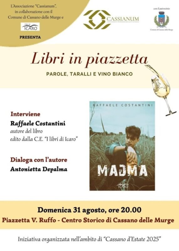 Alle ore 20.00 in piazzetta Ruffo (Centro storico), ultimo appuntamento per la rassegna “Liri in piazzetta- parole, taralli e vino bianco” a cura dell’Associazione “Cassianum”. Raffaele Costantini presenta il romanzo “Magma” (Icaro Editore).