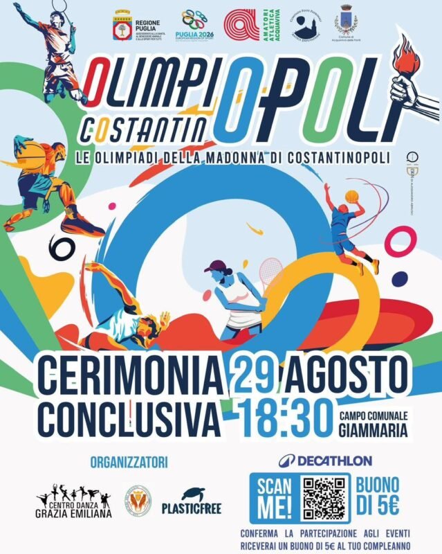 Si concluderà venerdì 29 agosto, dalle 18 allo stadio comunale “G. Giammaria”, la prima edizione di Olimpiopoli – Le Olimpiadi della Madonna di Costantinopoli, con una serata che unisce sport, tradizione e impegno civico.