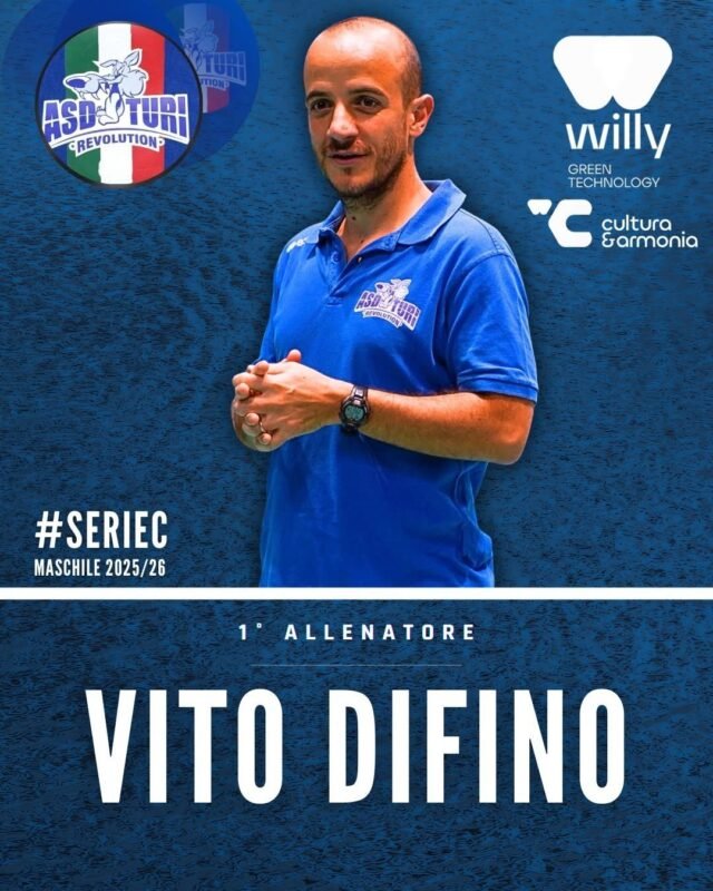 L’ASD Revolution Turi è lieta di annunciare la conferma di Vito Difino come allenatore della nostra prima squadra maschile, la Willy Green Technology Turi, per il prossimo campionato Nazionale di Serie C maschile.