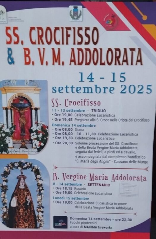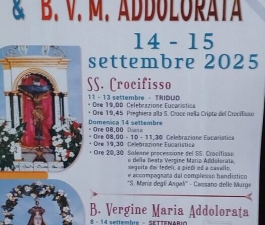 Domenica 14 e lunedì 15 settembre la Chiesa festeggia la Croce di Gesù e Maria Addolorata, con un periodo di preparazione spirituale in vista della processione congiunta del 14 settembre prossimo. Questo il programma dei festeggiamenti, organizzati dalla Parrocchia Santa Maria Assunta e dalle relative Confraternite.