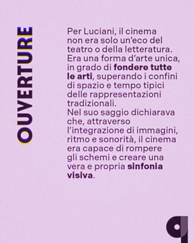 Chi era Sebastiano Arturo Luciani? Nato ad Acquaviva delle Fonti nel 1884 fu un eccletico compositore, musicologo e critico cinematografico. Studiò composizione a Napoli e Roma, approfondì anche letteratura e filosofia a Firenze città che ne plasmò la visione. La sua curiosità spaziava dalle opere antiche alle operette contemporanee con uno sguardo sempre rivolto al futuro dell’arte. Luciani condivideva con i Futuristi l’entusiasmo per le nuove forme d’arte e la rottura con le tradizioni, entrambi riconoscevano il cinema come un mezzo rivoluzionario capace di catturare il dinamismo della modernità”.