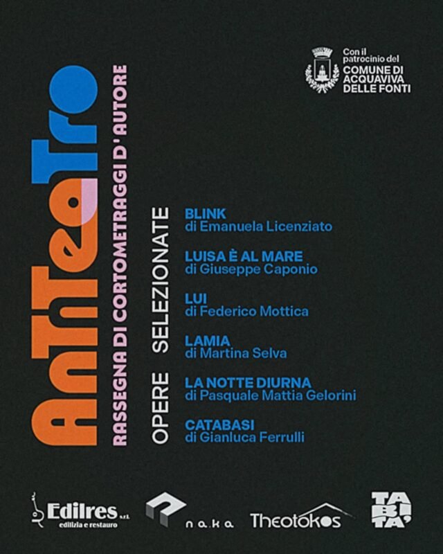 Il progetto è stato promosso dall’Associazione Theotókos che ha trovato il suo quartier generale in Tabità – La casa dei talenti in collaborazione con l’associazione Naka di Noicattaro, realizzato con il patrocinio del Comune di Acquaviva delle Fonti si è posto l’obiettivo di dare visibilità a registi esordienti promuovendo al tempo stesso il territorio attraverso la cultura. Sponsor di “Antiteatro”: Edilres srl di Silvio ed Emanuele Cordasco.