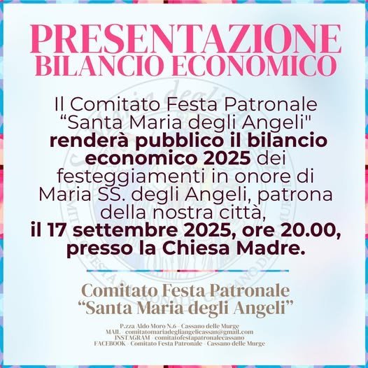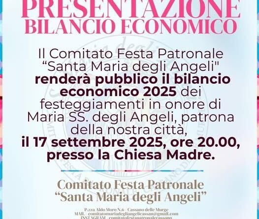 Il Comitato Festa Patronale “Santa Maria degli Angeli” di Cassano delle Murge invita la cittadinanza alla presentazione del bilancio economico 2025, un momento di chiarezza e condivisione sulla Festa Patronale appena conclusa.