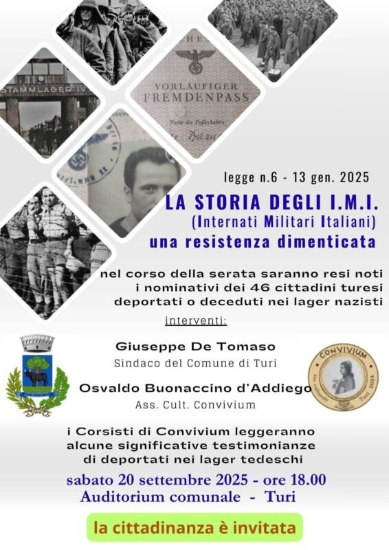 La loro storia sarà ricordata sabato 20 settembre a Turi (Auditorium ore 18) grazie all’impegno del professor Osvaldo Buonaccino D’Addiego. Verranno resi noti i nomi dei 46 cittadini turesi deportati o deceduti nei lager nazisti.