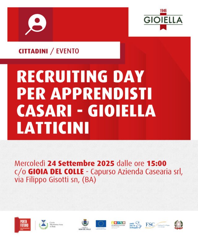 Dopo il successo delle precedenti selezioni, tenute per tre anni sempre da Porta Futuro, con il 90% delle risorse assunte stabilmente in azienda al termine del percorso professionalizzante; mercoledì 24 settembre 2025 alle ore 15:00 in via Filippo Gisotti sn a Gioia del Colle (BA), Porta Futuro Area Metropolitana di Bari organizza un nuovo recruiting day per conto di Gioiella Latticini/Capurso Azienda Casearia srl.
