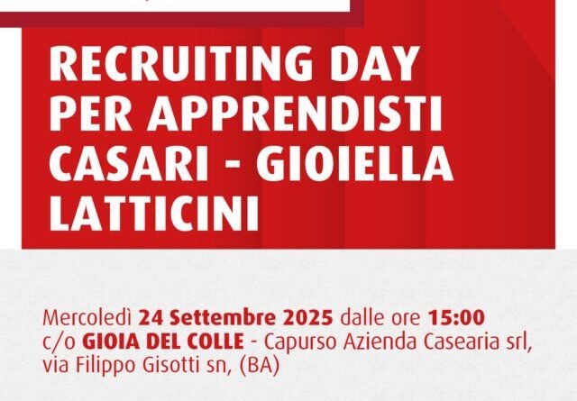 Dopo il successo delle precedenti selezioni, tenute per tre anni sempre da Porta Futuro, con il 90% delle risorse assunte stabilmente in azienda al termine del percorso professionalizzante; mercoledì 24 settembre 2025 alle ore 15:00 in via Filippo Gisotti sn a Gioia del Colle (BA), Porta Futuro Area Metropolitana di Bari organizza un nuovo recruiting day per conto di Gioiella Latticini/Capurso Azienda Casearia srl.