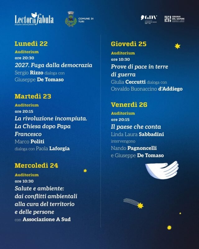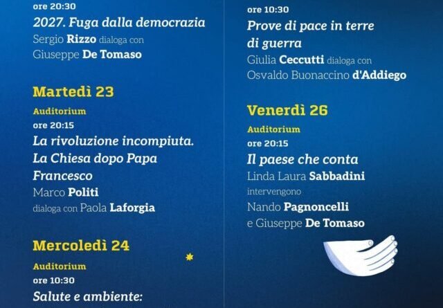 Ad aprire il ciclo sarà Sergio Rizzo, che dialogherà con il sindaco Giuseppe De Tomaso sul suo ultimo libro “2027. Fuga dalla democrazia” (Solferino Editore). Un saggio che mette in guardia dal progressivo indebolimento delle istituzioni democratiche, con uno sguardo attento alle derive autoritarie della politica e della società contemporanea.