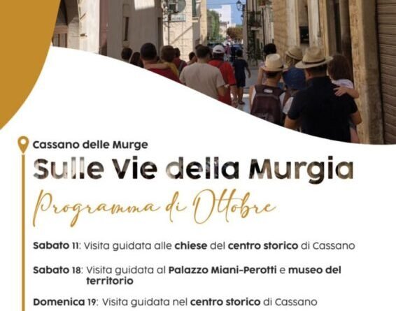 “Sulle Vie della Murgia” è un progetto promosso da Apulia Country Proloco APS e nasce per valorizzare il patrimonio storico, culturale e paesaggistico del territorio ed è pensata non solo per i cittadini cassanesi, ma anche per turisti e visitatori che desiderano vivere un’esperienza autentica nel cuore della Puglia. Il calendario propone appuntamenti diversificati che uniscono cultura, natura e gusto. Il progetto comprende un ricco programma di attività organizzate a Cassano delle Murge, alcune già svolte a settembre 2025 ed altre in programma fino a gennaio 2026.