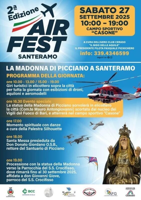 Una giornata all’insegna dello spettacolo e dell’adrenalina con la seconda edizione dell’Air Fest, in programma sabato 27 settembre presso il campo sportivo Casone a Santeramo in Colle. L’iniziativa rientra nel calendario del programma civile dedicato ai festeggiamenti per la Madonna di Picciano, e promette di regalare emozioni indimenticabili a grandi e piccoli.