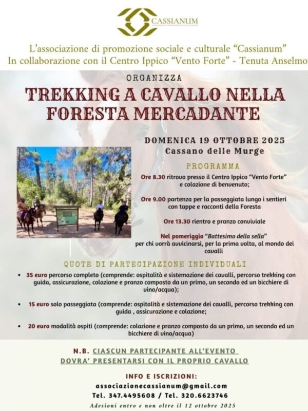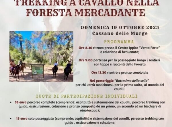 L’Associazione di promozione sociale “Cassianum” in collaborazione con il Centro Ippico “Vento Forte” – Tenuta Anselmo organizza una giornata di “Trekking a cavallo nella foresta Mercadante” a Cassano delle Murge domenica 19 ottobre 2025