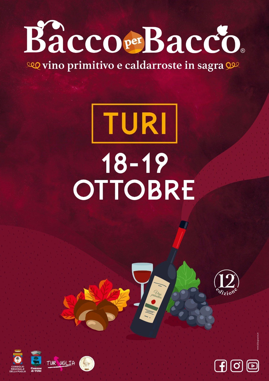 Il 18 e 19 ottobre torna a Turi l’attesissima sagra “Bacco per Bacco”, giunta quest’anno alla sua 12ª edizione e realizzata dalle Associazioni “Turpuglia” e “I vecchi tempi” con il patrocinio e il contributo del Consiglio regionale della Puglia e del Comune di Turi. Un traguardo che conferma il grande successo di una manifestazione ormai radicata nel cuore della comunità e dei visitatori, capace di valorizzare i sapori dell’autunno e le tradizioni culturali del territorio.