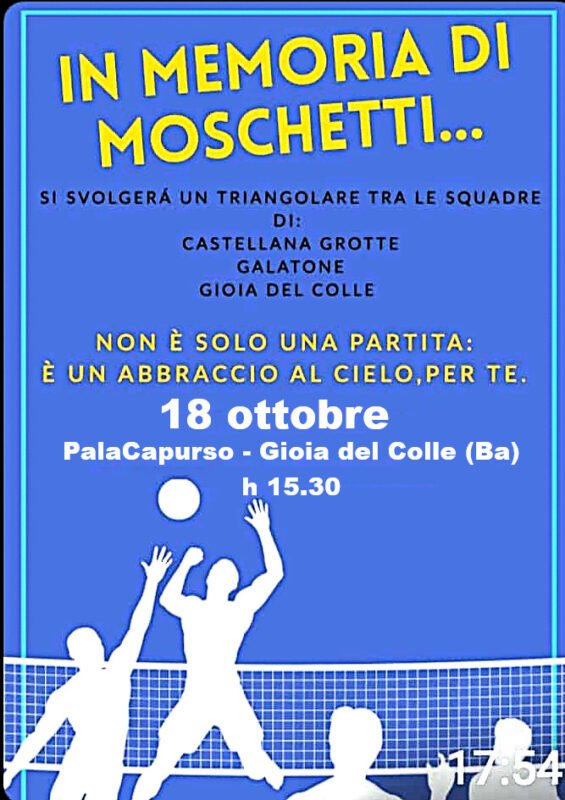 L’evento vedrà in campo Joy Volley Gioia del Colle, BCC Tecbus Castellana Grotte e Green Volley Galatone in una giornata che unisce sport, comunità e solidarietà. Oltre all’aspetto agonistico, il Memorial rappresenta un momento di condivisione e ricordo collettivo, fortemente voluto dalla società biancorossa e dalla famiglia Moschetti, che sarà presente sugli spalti insieme ai tanti amici di Federico.