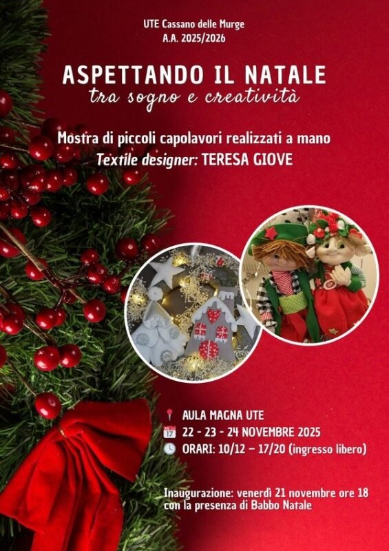 A poco più di un mese dalle festività natalizie, l’UTE (Università della Terza Età) di Cassano delle Murge si prepara a trasformare la sua sede in un incantevole villaggio delle meraviglie. Dal 22 al 24 novembre, le stanze dell’Università accoglieranno la straordinaria mostra artistica “ASPETTANDO IL NATALE TRA SOGNO E CREATIVITÀ“, a cura della textile designer Teresa Giove.