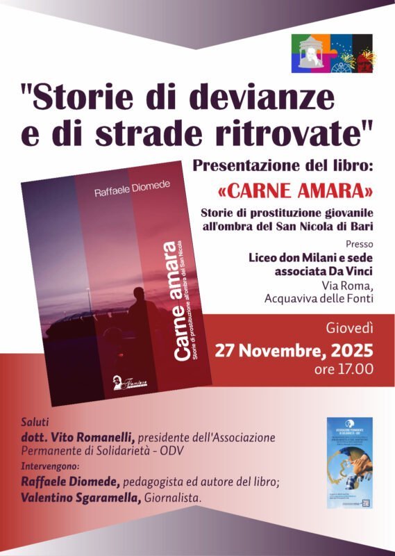 L’evento ospiterà la presentazione del libro Carne Amara Florestano Edizioni. Storie di prostituzione giovanile all’ombra del San Nicola di Bari di Raffaele Diomede, un’opera che affronta con lucidità e umanità il complesso fenomeno della prostituzione giovanile, raccontando storie e vissuti che si consumano ai margini, nell’ombra dello stadio San Nicola di Bari.