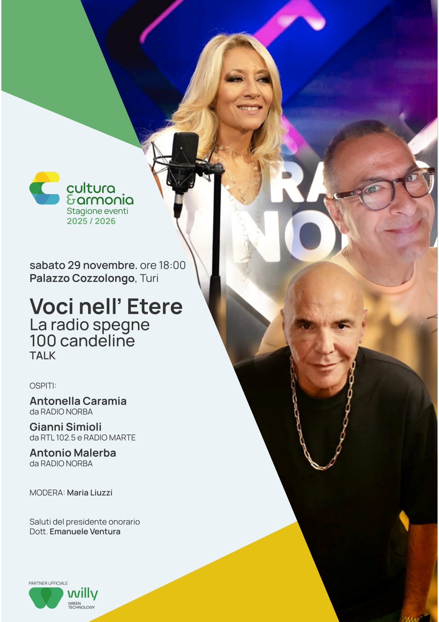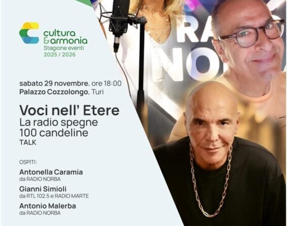 In occasione della Stagione Eventi 2025/2026 promossa da Cultura & Armonia A.P.S., Palazzo Cozzolongo ospiterà un appuntamento speciale dedicato a uno dei mezzi di comunicazione più longevi e amati: la radio. Sabato 29 novembre, alle ore 18:00 si apriranno le porte al talk “Voci nell’Etere – La radio spegne 100 candeline”, un incontro che rende omaggio a un secolo di narrazioni, emozioni e connessioni nell’etere.
