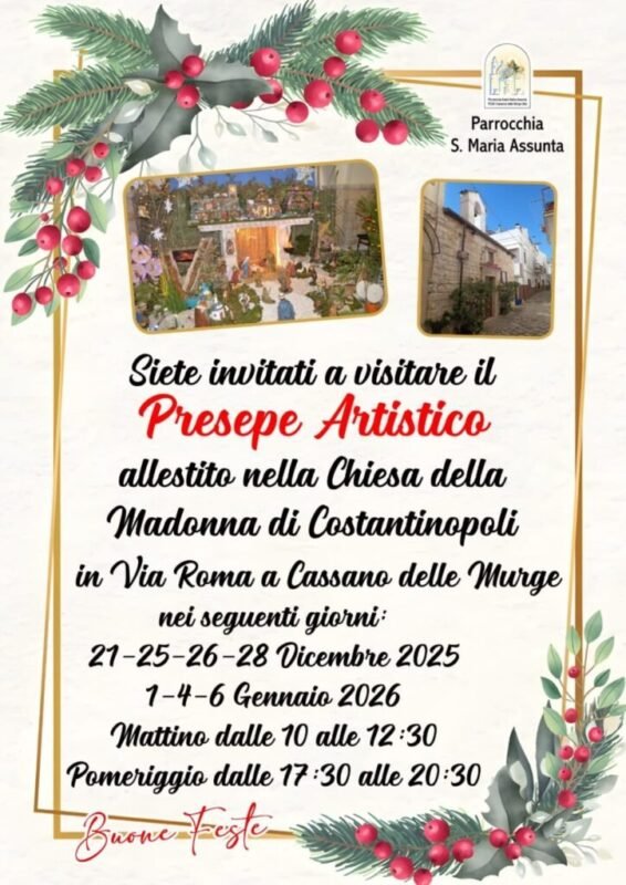 Tutto pronto per l’apertura del presepe artistico allestito nella Chiesa della Madonna di Costantinopoli. In via Roma si respira aria natalizia…..vi aspettiamo numerosi per la visita a partire da domani mattina mentre la mattina di natale, in chiesa madre sarà benedetto Gesù bambino durante la messa del fanciullo delle ore 10 per poi portarlo al presepe nella chiesetta.