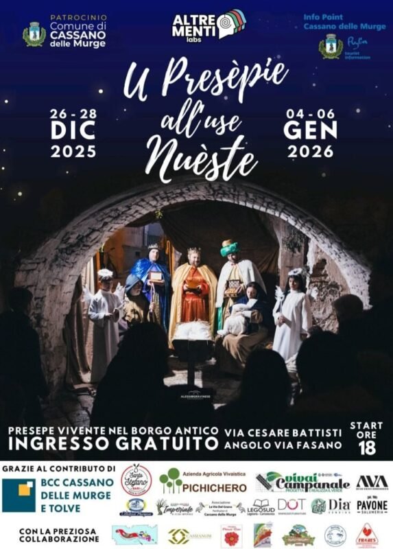 Torna anche quest’anno, grazie ad un gruppo di volontari con il sostegno di diverse associazioni e imprese e del Comune di Cassano delle Murge, “U presepie all’use nueste”, nel centro storico cassanese.