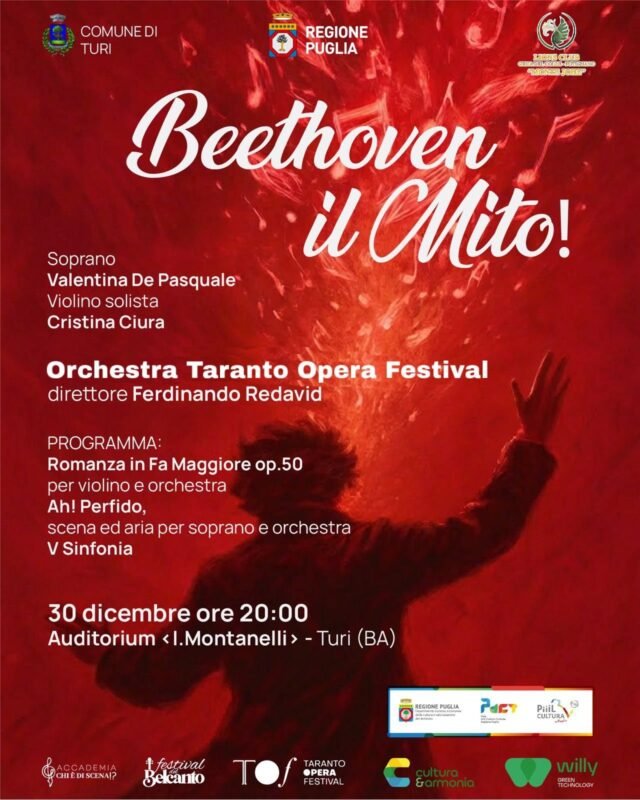 Un omaggio al genio di Ludwig van Beethoven andrà in scena martedì 30 dicembre alle ore 20.00 presso l’Auditorium “I. Montanelli” di Turi, con un concerto sinfonico promosso dal Festival del Belcanto.